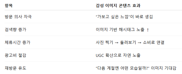 관광 마케팅에서 감성 이미지 콘텐츠가 갖는 ROI는 매우 단순하고 명확합니다.
